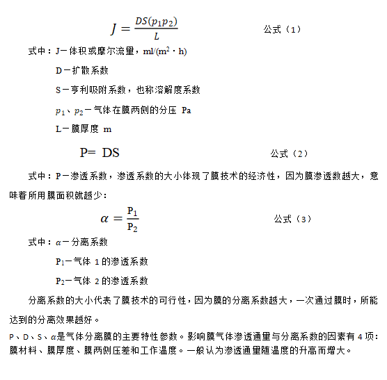 經(jīng)過(guò)以下3個(gè)步驟,由膜的高分壓側(cè)透過(guò)膜到達(dá)低分壓側(cè):①氣體吸附溶解在膜的高分壓側(cè);②在濃度差的作用下,溶解在高分壓側(cè)膜表面的氣體向低分壓側(cè)表面擴(kuò)散;③到達(dá)低分壓側(cè)膜表面的氣體從膜體中解吸。