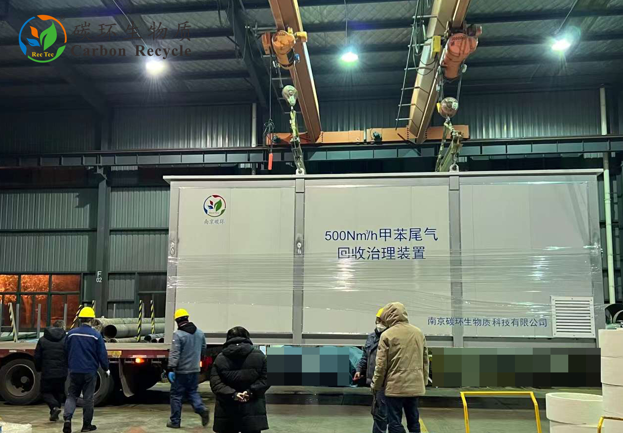 南京碳環(huán)工作人員根據(jù)實地勘察項目現(xiàn)場,為客戶設(shè)計、制造了“甲苯尾氣回收治理裝置”。