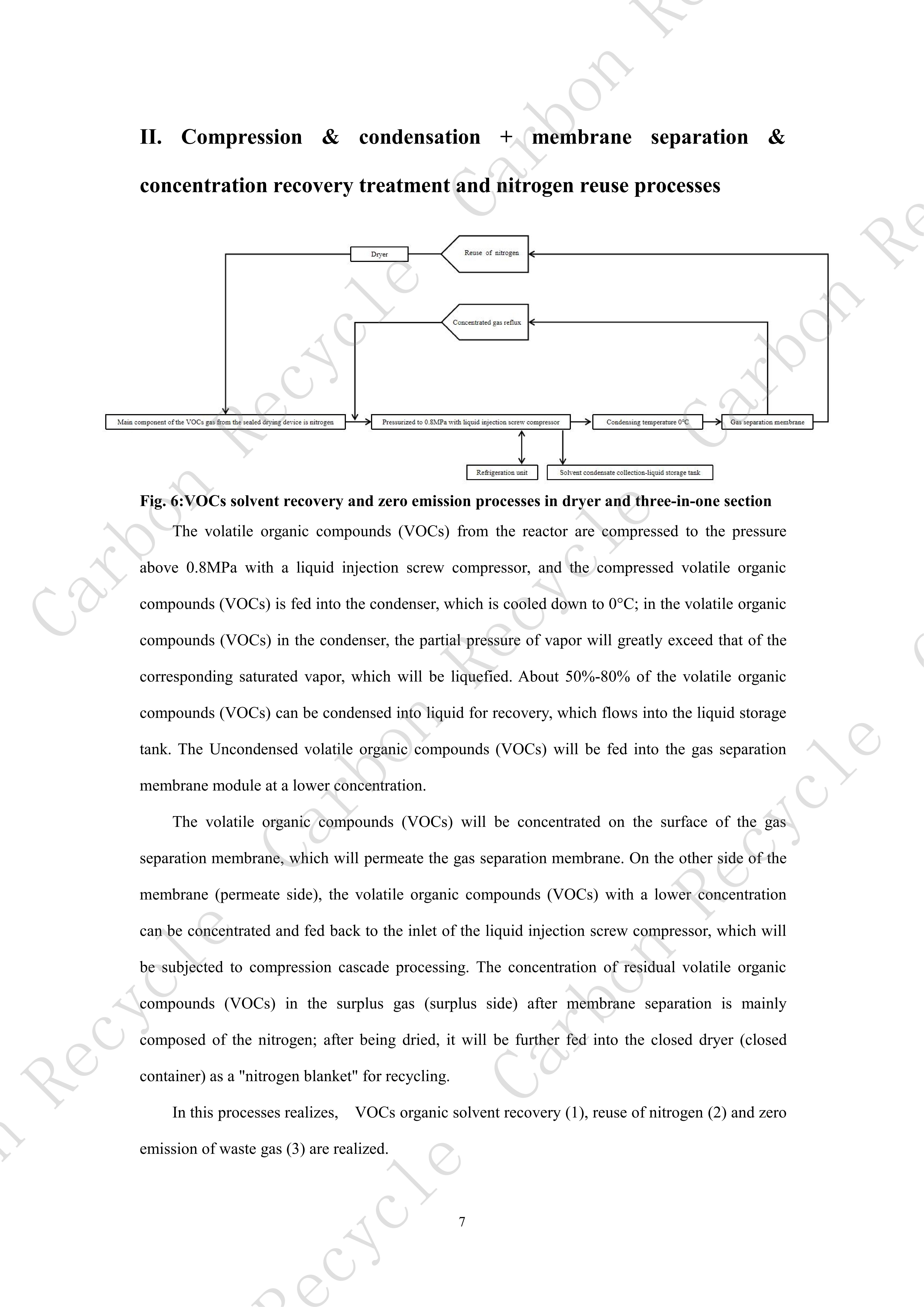 The volatile organic compounds (VOCs) from the reactor are compressed to the pressure above 0.8MPa with a liquid injection screw compressor, and the compressed volatile organic compounds (VOCs) is fed into the condenser, which is cooled down to 0°C; in the volatile organic compounds (VOCs) in the condenser, the partial pressure of vapor will greatly exceed that of the corresponding saturated vapor, which will be liquefied. About 50%-80% of the volatile organic compounds (VOCs) can be condensed into liquid for recovery, which flows into the liquid storage tank. The Uncondensed volatile organic compounds (VOCs) will be fed into the gas separation membrane module at a lower concentration.
