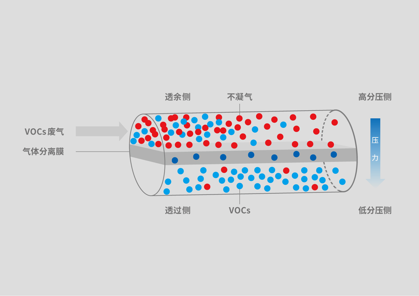 經(jīng)過(guò)以下3個(gè)步驟,由膜的高分壓側(cè)透過(guò)膜到達(dá)低分壓側(cè):①氣體吸附溶解在膜的高分壓側(cè);②在濃度差的作用下,溶解在高分壓側(cè)膜表面的氣體向低分壓側(cè)表面擴(kuò)散;③到達(dá)低分壓側(cè)膜表面的氣體從膜體中解吸。